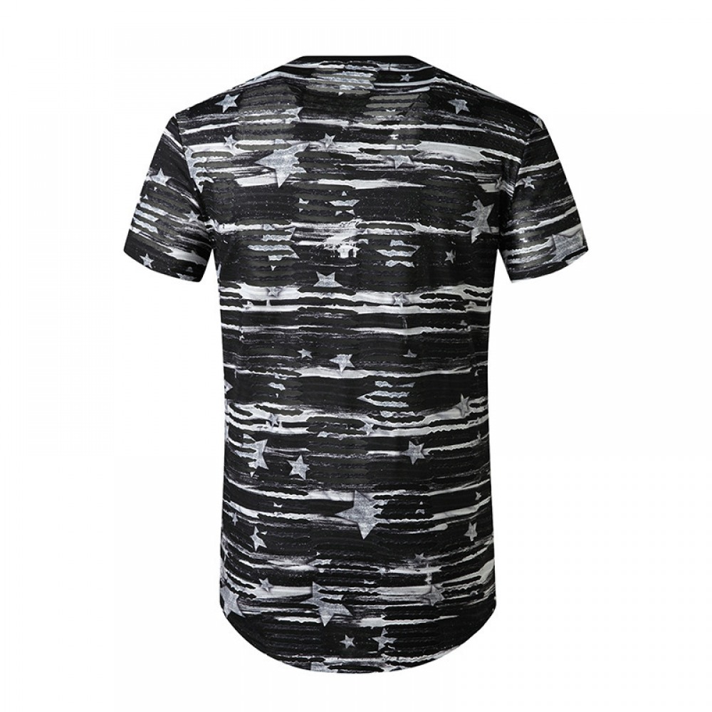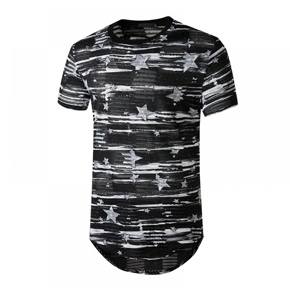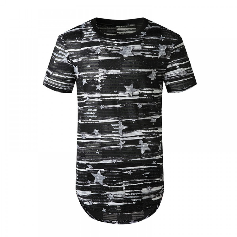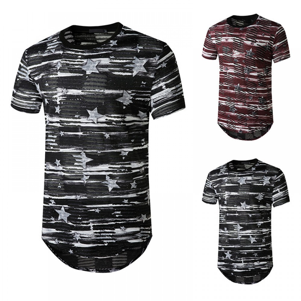 Hip Hop High Street Summer Men's Round Hem High Street Striped Long Short Sleeve T-Shirt